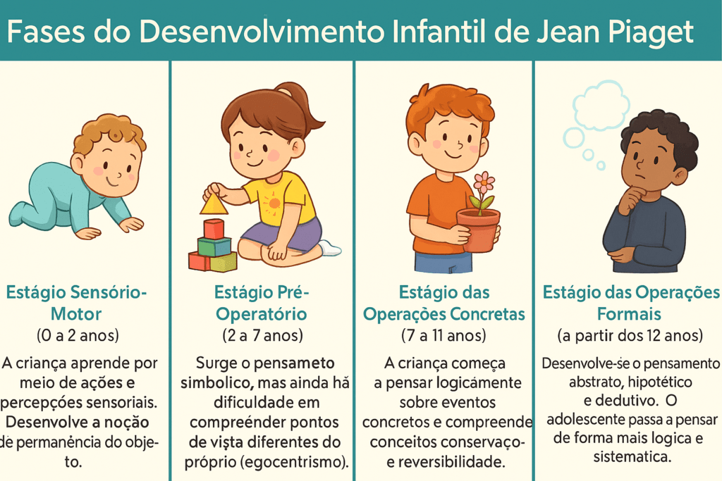• Estágio das Operações Formais (a partir dos 12 anos): Desenvolve-se o pensamento abstrato, hipotético e dedutivo. O adolescente passa a pensar de forma mais lógica e sistemática.