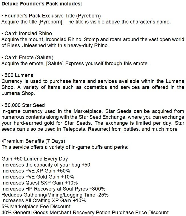 Apesar de gratuito, é possível adquirir três diferentes tipos de “pacotes de fundador”: Deluxe, Exalted e Ultimate, que custam, respectivamente, R$47,69, R$79,19 e R$143,09. Além de alguns itens cosméticos, esses pacotes trazem benefícios aos jogadores que possibilitam que seus personagens evoluam mais rápido dentro do game e tenham moedas para trocar por itens na casa de leilão. Enquanto alguns tentam “passar um pano” e afirmar que isso apenas ajuda a “upar mais rápido” (o famoso payt-to-fast), é inegável que uma pessoa afortunada que resolver “investir” uma grana considerável no jogo, fatalmente conseguirá os melhores equipamentos sem precisar despender tanto tempo para isso.