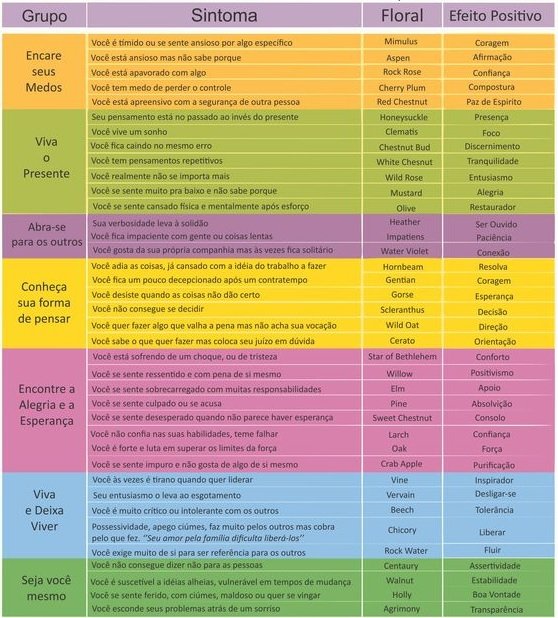 Segue abaixo, uma tabela com os 38 florais, seus efeitos e a qual grupo pertencem: