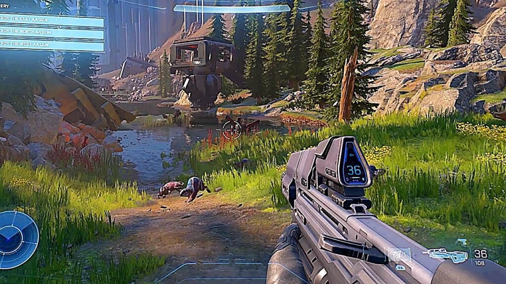 Halo Infinite também se baseia na coleção de armas da série, adicionando uma variedade de novas armas para obliterar, derreter, zapear e esmagar seus inimigos até a morte. O conceito central permanece inalterado: armas alienígenas vaporizam escudos espartanos enquanto armas de fogo humanas rasgam os pedaços carnudos desprotegidos. Mas há mais algumas considerações agradáveis a serem lembradas desta vez. Por exemplo, o Rifle de choque pode desintegrar um alvo com um tiro na cabeça, mas enviar um raio no peito de um espartano pode fazer com que os tiros baseados em eletricidade atinjam alvos adicionais, causando dano aos inimigos próximos. Os disparos da arma também podem atrapalhar os veículos, paralisando os Warthogs ou fazendo com que os Banshees caiam do céu. A maioria das novas armas de Halo Infinite são projetadas de forma semelhante, apresentando efeitos secundários ou modos de fogo que, quando usados estrategicamente, levam a resultados satisfatórios e ao mesmo tempo bastante divertidos.