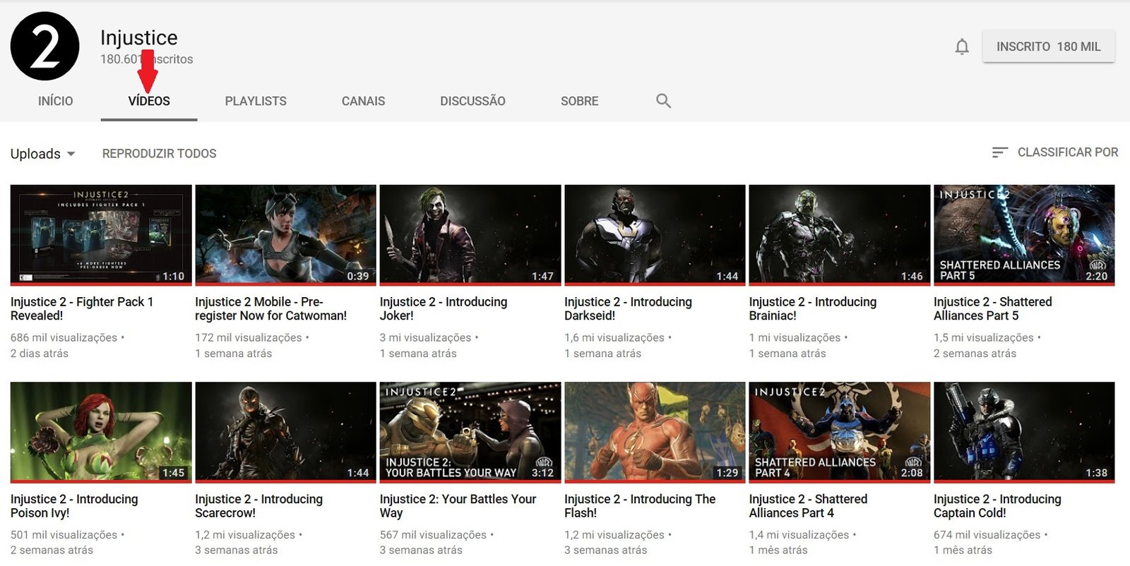 E para quem desejar saber um pouco mais sobre algumas características de cada um dos personagens descritos na tabela acima ou ver um pouco do gameplay do(s) personagem(ns) favorito(s), clique na imagem abaixo para visitar o Canal Injustice no YouTube e visite a categoria “vídeos” (marcado com seta vermelha). Neste canal, você poderá assistir a uma grande diversidade de vídeos, desde a história, apresentação de cada personagem, customização até animações e novidades que estarão presentes no game.