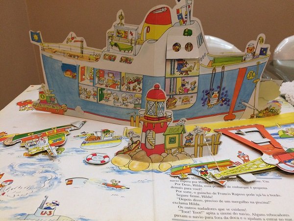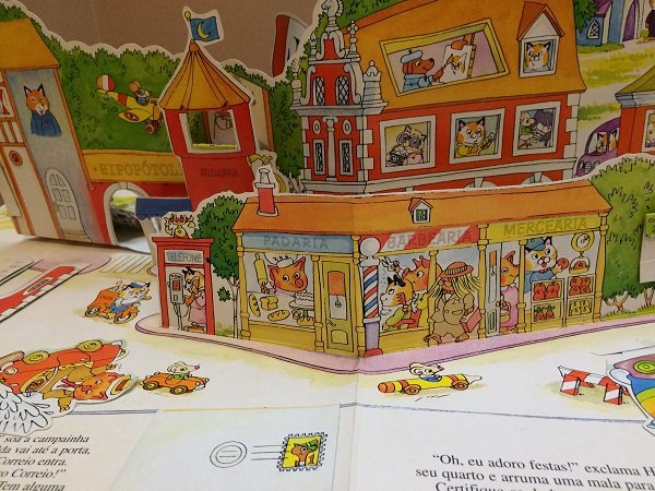 Meus pais sempre incentivaram. Somos 4 irmãos e, eu e dois dos meus irmãos, entramos na escola alfabetizados. Sempre que possível, meu pai trazia alguma revista ou livro. Tínhamos longas enciclopédias em casa e me lembro que eu adorava ler. Alguns livros se perderam com o tempo, com mudanças de residências e outros, ficaram conosco por muito tempo. Recentemente, mudei de residência e encontrei um livro que tem, pelo menos uns 25 anos. O livro é uma graça. Tem vários pop-ups. Olhem só que fofo: