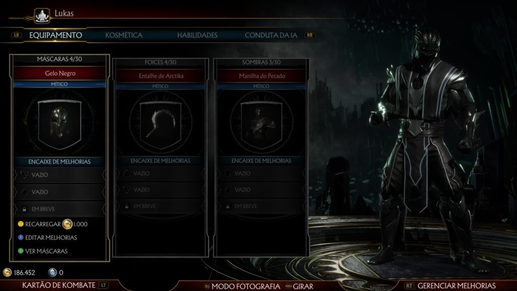 – Personagem: Aqui, você pode mexer na aparência dos seus personagens e personalizar os itens e golpes que kada um terá. No momento, são cerca de 50 a 60 skins, além de 150 itens (divididos em três konjuntos, variáveis por lutador) para kada um dos 25 personagens! Você pode komprá-los na loja do jogo, achá-los na Krypta ou ganhá-los nas Torres do Tempo.