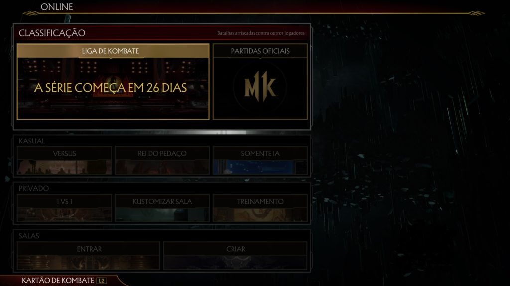 – Online: Vários modos de jogo para se duelar kontra outros oponentes que estiverem no mesmo servidor que você. Já é possível jogar partidas rankeadas, kasuais, kriar salas e kolocar suas regras nelas, etc. Um ponto positivo para o game foi que, ao kontrário de muitos jogos que são precários nos modos online logo nos primeiros dias de lançamento, MK11, apesar de lotado, apresentou servidores bens estáveis desde o início.