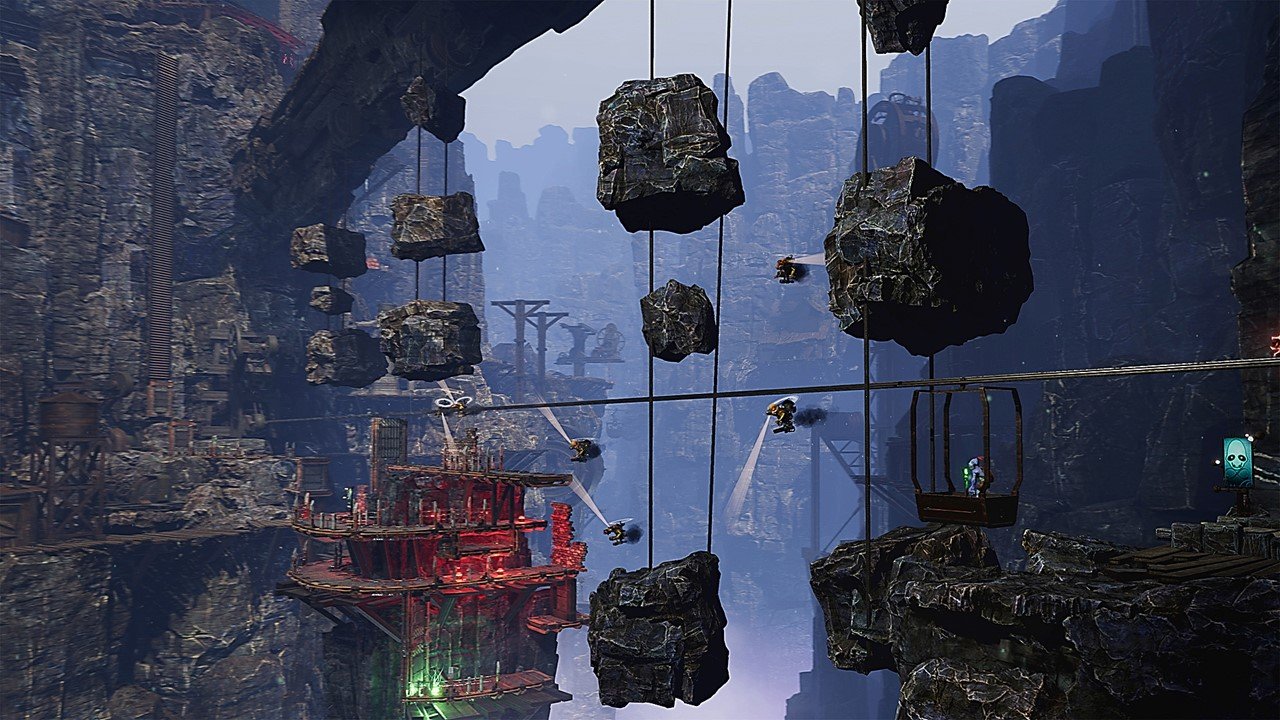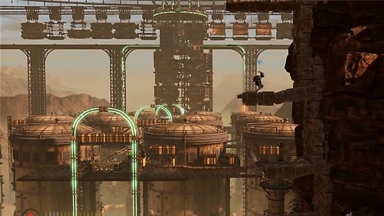 Mesmo que você ainda não tenha uma afeição por Oddworld, Soulstorm parece ótimo e os níveis apresentam o que o desenvolvedor Oddworld Inhabilities chama de estilo visual “2.9D”: arte 3D em um plano 2D, que gira e muda para fazer os níveis parecerem menos lineares. No fundo, muitas vezes você pode ver um nível inteiro estendido ao longe, junto com faces de montanhas rochosas, edifícios enormes e máquinas de fábrica, que criam um incrível senso de escala. Abe, por mais importante que seja, é apenas um peixe pequeno em comparação com a vasta paisagem industrial de Oddworld. Embora o plano de fundo muitas vezes seja apenas um cenário, há alguns casos em que os elementos do plano de fundo vêm à tona e, embora isso não seja um novo truque, a animação suave de um trem vindo em sua direção continua impressionante.
