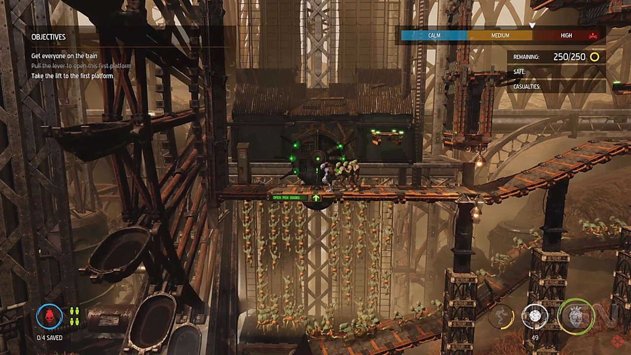 Uma coisa interessante é liderar um grupo de Mudokons, pois depois de recrutá-los, os mesmos seguirão Abe de perto, a menos que você diga a eles para ficarem quietos. Embora estejam muito próximos, um grupo de retardatários torna seus movimentos mais fáceis de detectar. E embora eles possam se defender tecnicamente se você lhes der ferramentas, morrerão rapidamente se forem vistos e também pisarão direto em uma mina terrestre, mesmo se você pular sobre ela. Com isso, mover-se com aliados a reboque exige que você tome o passo mais lento e constante e dê um amplo espaço para cada obstáculo. Pode ser um jogo interessante e mais estratégico, mas “machuca” quando alguém é esmagado por um pistão porque não deu aquele passo a mais para se esquivar de um pêndulo gigante.