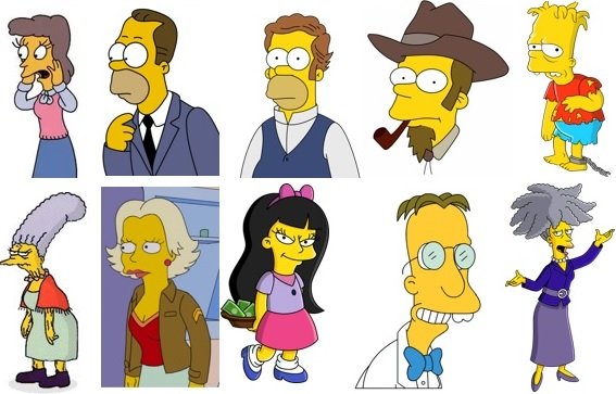 Da esquerda para a direita: Helen Lovejoy, Herbert Powell, Hiram Simpson, Howland Simpson, Hugo Simpson, Jackie Bouvier, Jenda Watson, Jessica Lovejoy, John Frink e Judith Terwilliger.