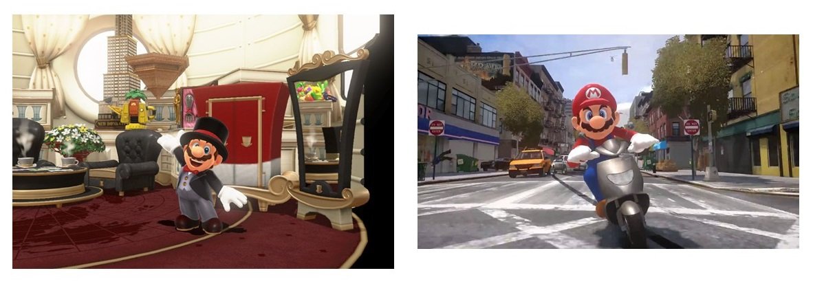 Uma das facetas mais interessantes de Super Mario Odyssey é a incorporação do game Super Mario Bros. de 8 bits. E como essas seções são 2D, é lógico que ocorram na superfície de locais como fundos de lago e no lado de arranha-céus. Apesar da grande diferença na apresentação, os desafios retro se encaixam de maneira inteligente não apenas nos espaços que você está explorando, mas também no fluxo geral do jogo. É também a base para uma das cenas mais elaboradas e comoventes do jogo, especialmente se você é fã de Mario.