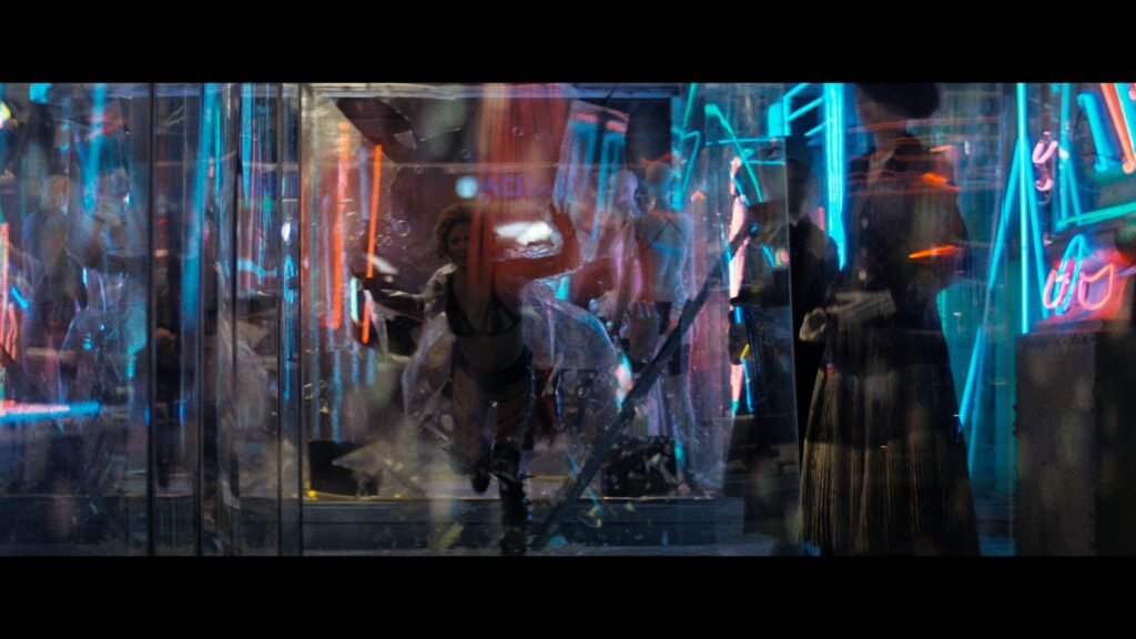 Deckard começa sua investigação e descobre que Zhora trabalha como dançarina em um clube. Furando barreiras e invadindo camarins, consegue chegar até ela. Ao ver que foi descoberta, a replicante foge, dando início a uma belíssima cena de perseguição, cuja trilha sonora é perturbadora, porém, marcante. A cena termina com a androide sendo eliminada após receber tiros nas costas e quebrar a vidraça de uma loja, caindo no chão já sem “vida”.