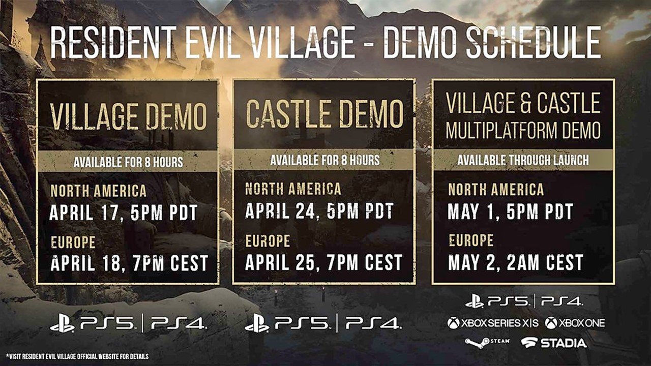 A Capcom também confirmou os detalhes das versões DEMO (Village e Castle) por tempo limitado que chegará em várias plataformas no dia 1º de Maio, com acesso antecipado para os proprietários de PlayStation 4 e PlayStation 5 a partir de 17 de Abril.