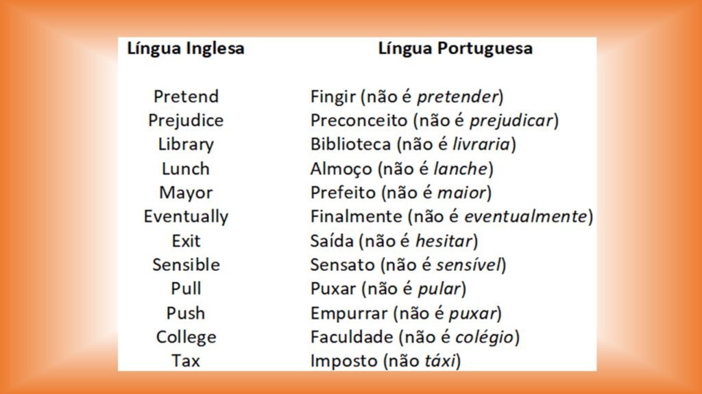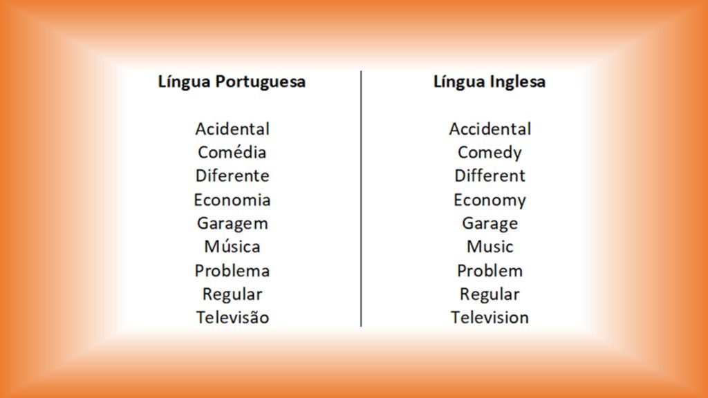 Porém, existem palavras que possuem grafias e pronuncias semelhantes, mas significados totalmente diferentes. Esses são os chamados Falso Cognatos. Lembrando que eles podem ocorrer em qualquer língua, certo?