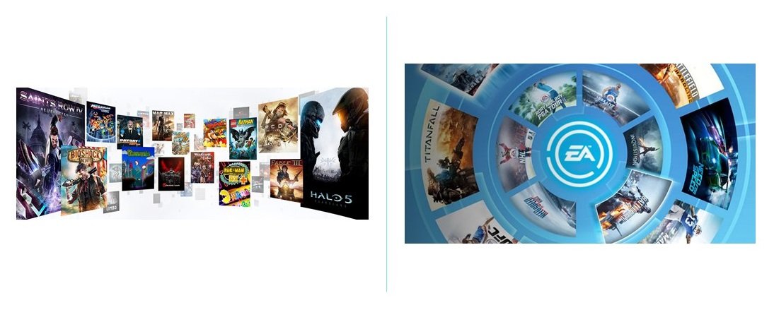 A imagem ilustra 2 dos melhores serviços do Xbox One: o Xbox Game Pass (esquerda) e o EA Access (direita)!