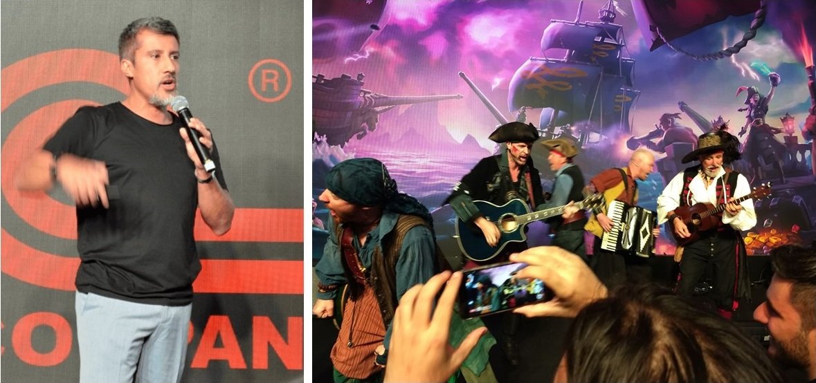 Esteban Lora, gerente do programa ID@Xbox, (esquerda) e cantores irreverentes do game Sea of Thieves (direita).