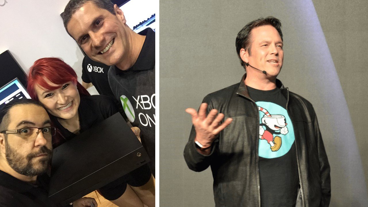Foto da esquerda: Nelson, Thaís e Willen com o One X no dia seguinte à FanFest. Foto da direita: Phil Spencer revelando a novidade!